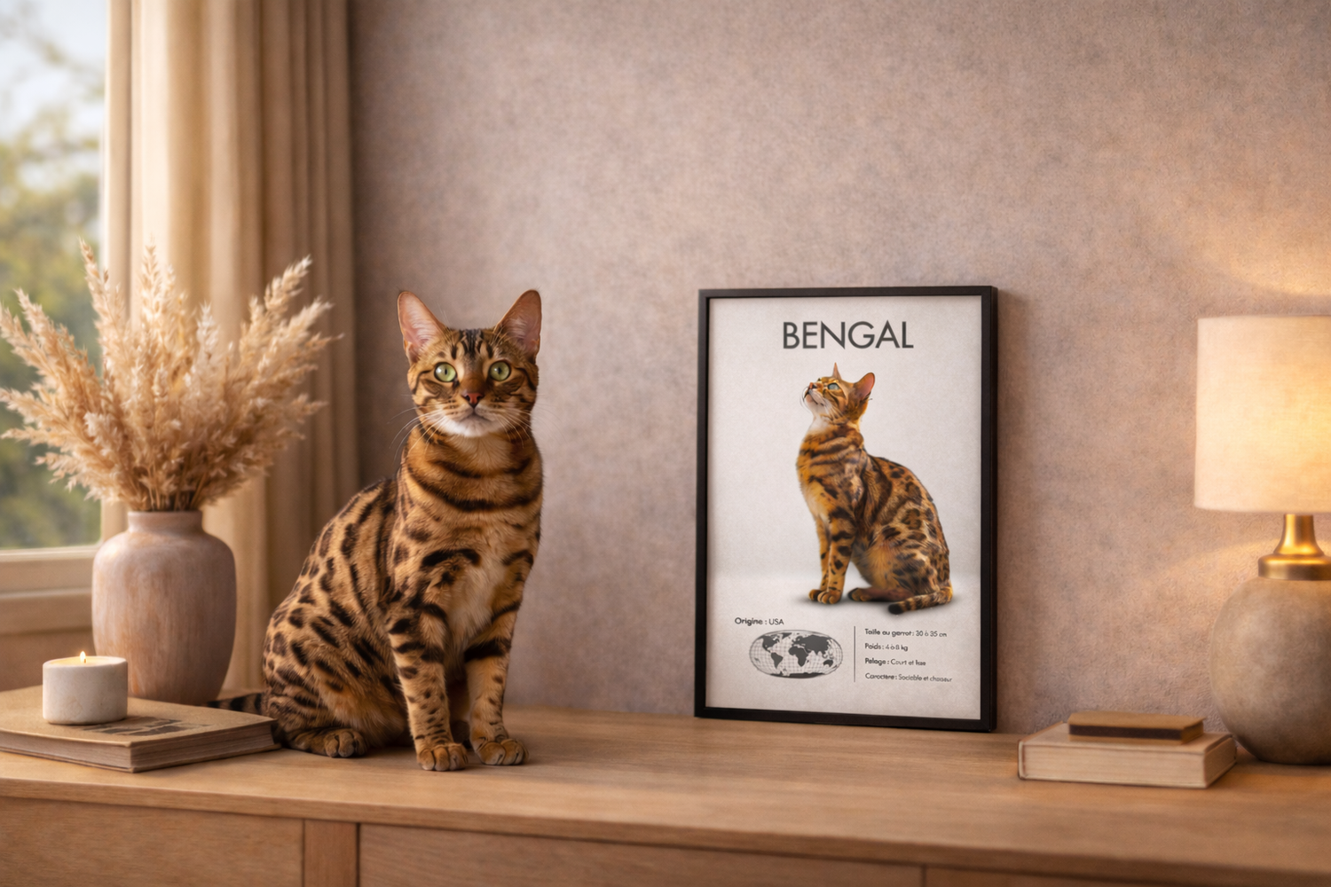 Créez et mettez en valeur votre décor intérieur avec une œuvre qui vous est chère. Design, beauté et élégance sont nos maîtres-mots. Nos tableaux personnalisés ne se contentent pas d’embellir vos murs, ils racontent une histoire unique qui reflète la connexion que vous avez avec votre félin.